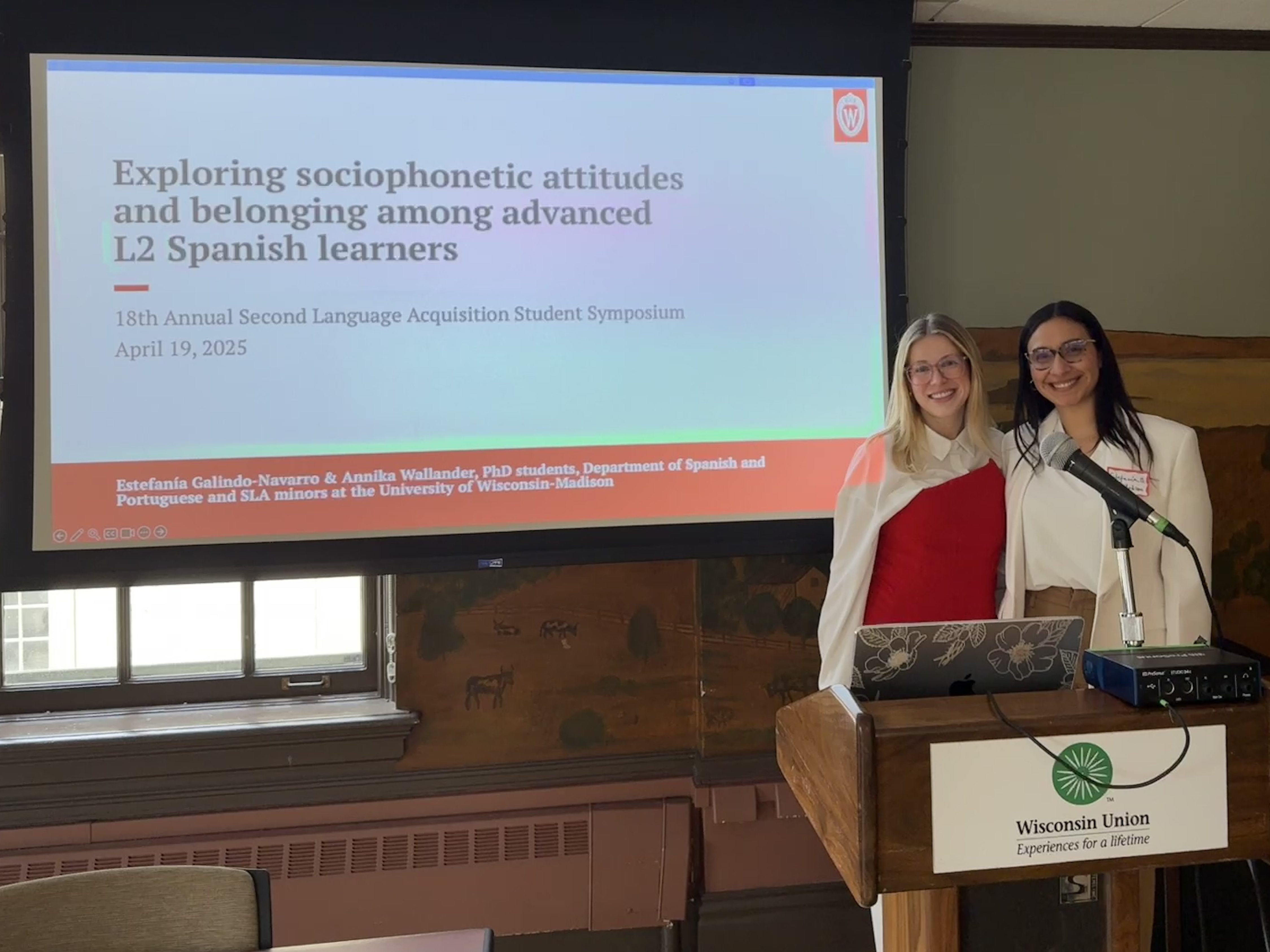 Galindo-Navarro Estefanía & Wallander, Annika “Exploring sociophonetic attitudes and belonging among advanced L2 Spanish learners”. 2025 SLA Symposium, Doctoral Program in Second Language Acquisition, University of Wisconsin-Madison. (Madison, WI, United States) [Oral presentation]